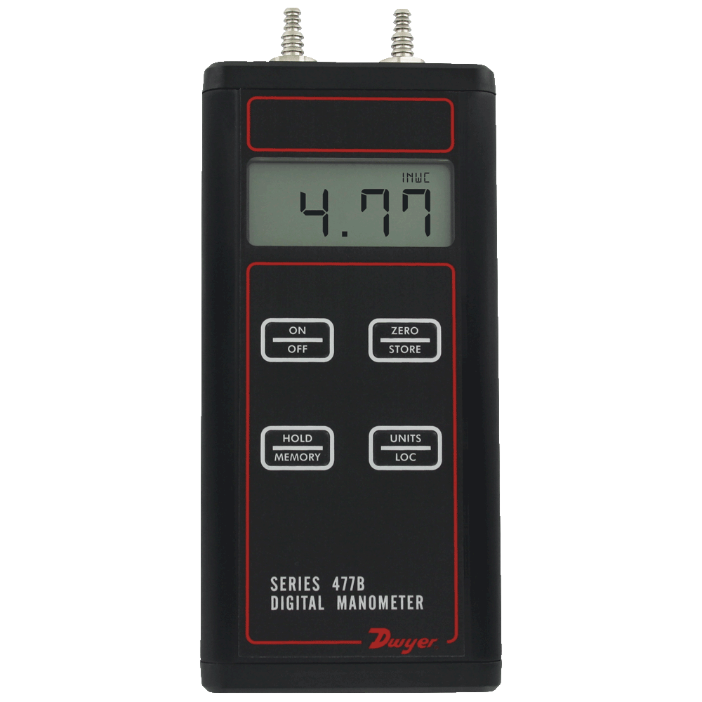 Brand: Dwyer Instruments, Inc.The Series 477B Handheld Digital Manometers are versatile, hand-held, battery operated manometers available in several basic ranges from 0-20 in w.c. up to 100 psi. All models measure either positive, negative or differential pressures with ±0.10% of full scale accuracy. You can select from up to seven common English and metric pressure units so conversions are not necessary.