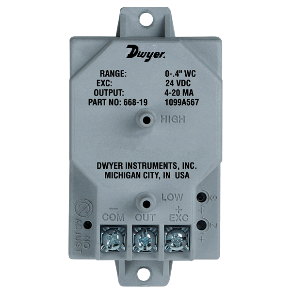 Our low cost SERIES 668 Differential Pressure Transmitter is capable of measuring low pressures with a ±1% accuracy - ideally suited for proper building pressurization and air flow control. Transmitters can withstand up to 10 psig overpressure with no damage to the unit. Variable capacitance sensor design provides excellent sensitivity and long-term stability. Compact, lightweight design makes installation simple and easy. Units also feature reverse-polarity protection.