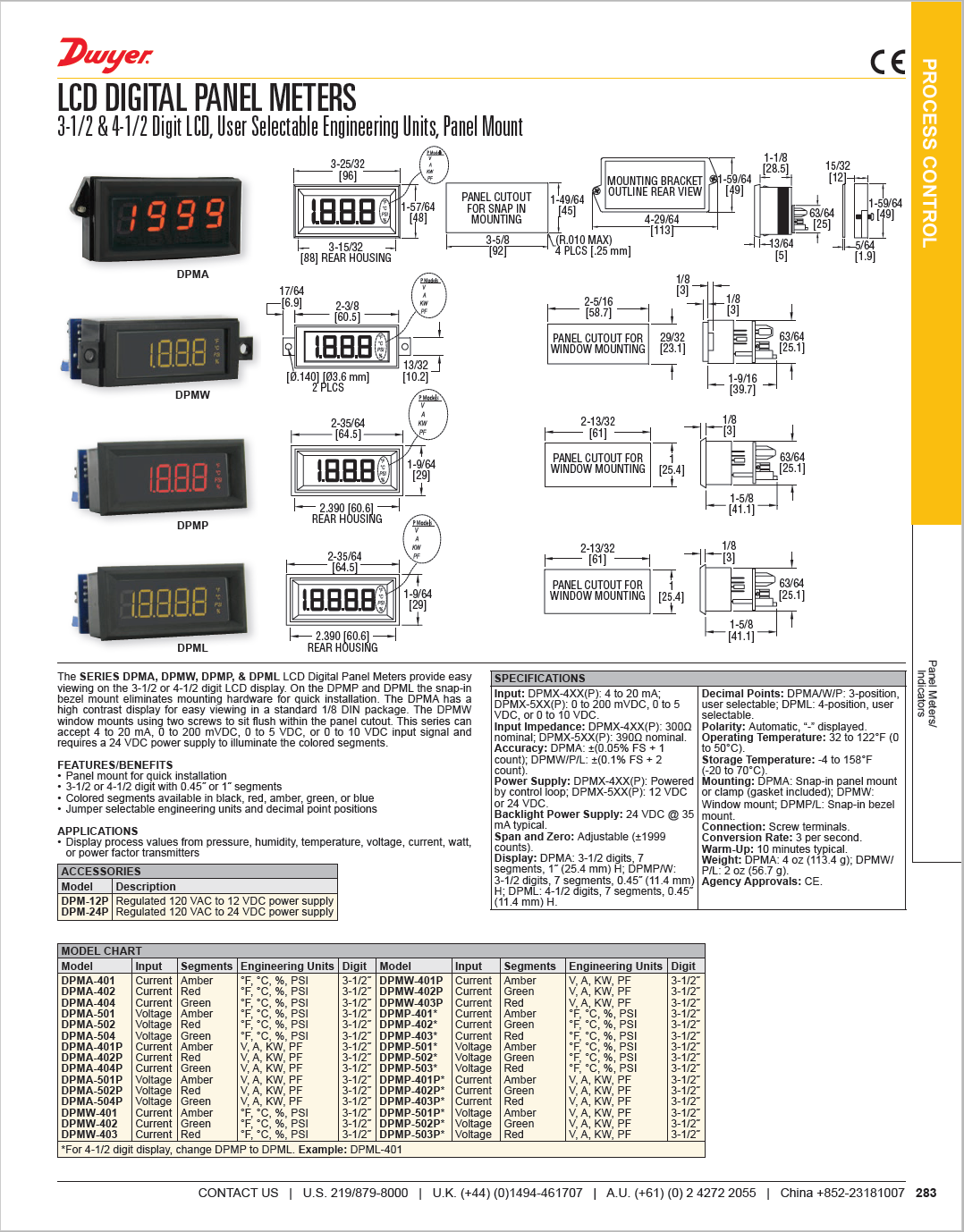 The Series DPMP & DPML LCD Digital Panel Meters provide easy viewing on the 3- 1/2 or 4-1/2 digit LCD display. The display segments are available in a choice of amber, black, red or green. The meter features user-selectable engineering units, adjustable span and zero and field-selectable decimal point position. The snap-in bezel mount eliminates mounting hardware for quick installation. A 24 Vdc power supply is required for the operation of the backlight.