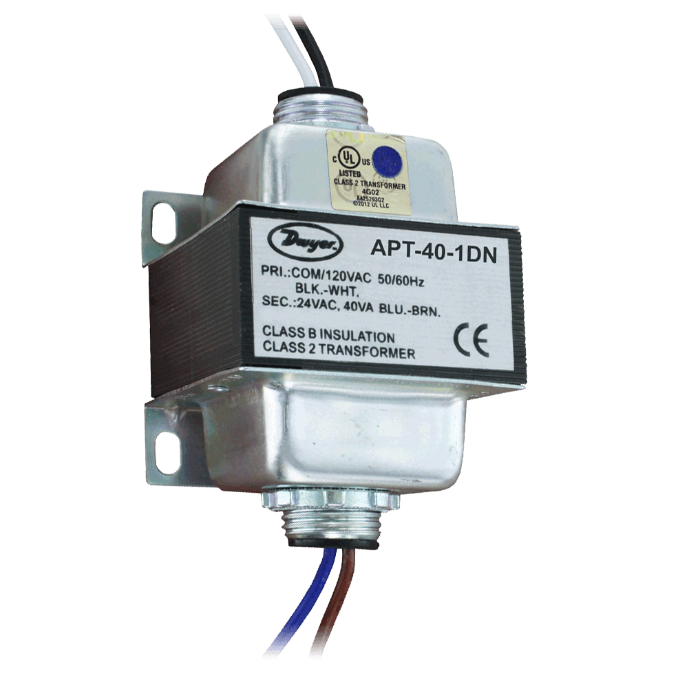 The SERIES APT AC Power Transformers provide isolated step-down to 24 Vac with models offering VA ratings of 20, 40, 50, 75, 96, or 150 VA's. These cost efficient transformers are offered in single or dual 1/2" NPT threaded hub mounts with 8-1/2" 18 AWG wire leads, to meet the installation requirements of a variety of building automation and control panel applications in HVac. All models are UL Class 2 listed.