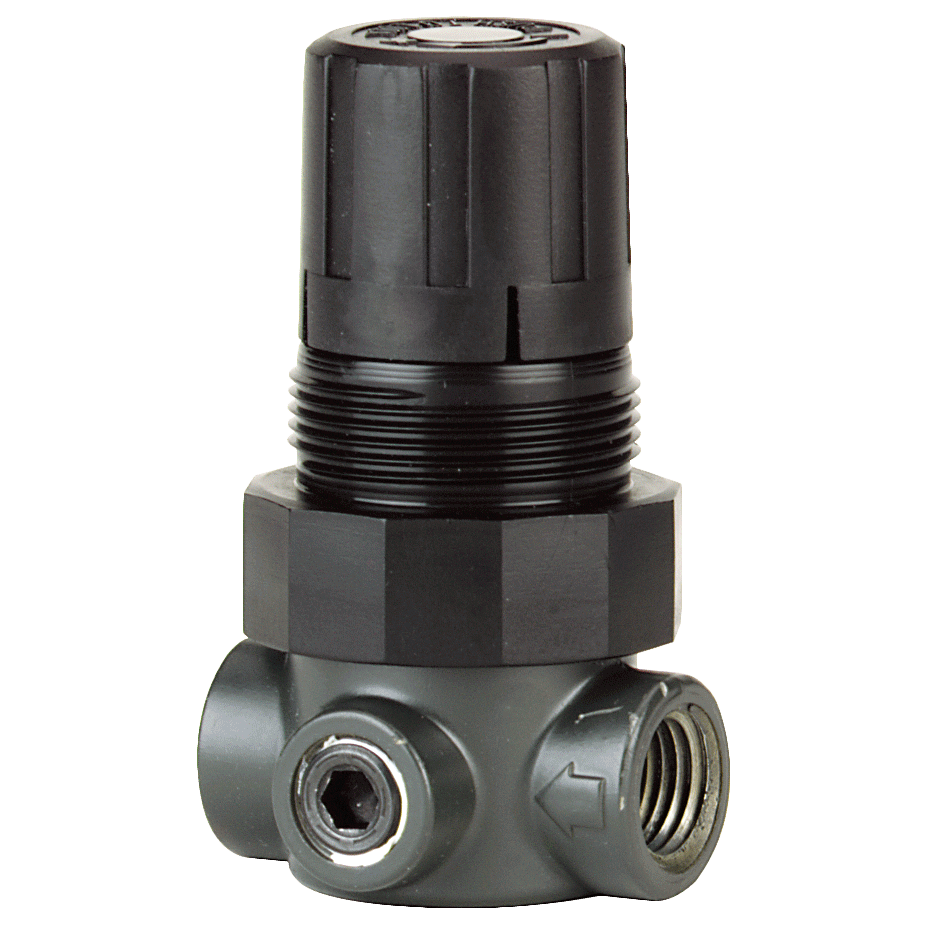 The SERIES MPR Miniature Pressure Regulators are compact units that provide low cost, high performance pressure regulation of compressed air or air/water. The low torque, non-rising adjustment knob with locking capability provides easy and precise adjustment. Models for use with air are self relieving. Models for air/water are non-relieving.