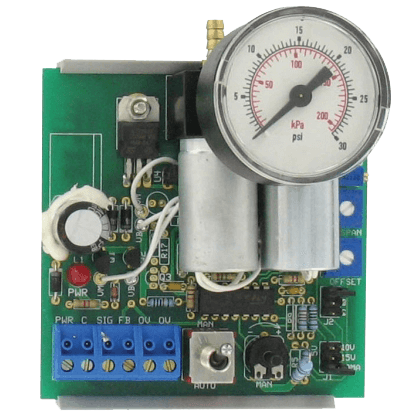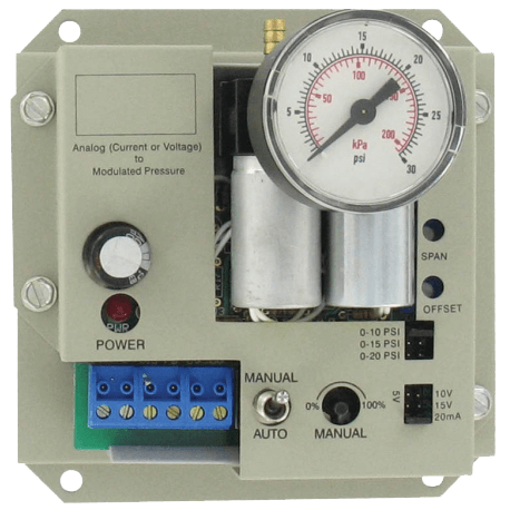 The EPTA offers adjustable span and offset as well as manual override. This unit has no air consumption and is immune to mounting orientation. Output pressure ranges include field-selectable 0 to 10, 0 to 15, and 0 to 20 psig. Also included is an analog 0 to 5 VDC feedback signal indicating the resultant branch line pressure. Universal 24 VAC/24 VDC supply voltage and field-selectable 4 to 20 mA, 0 to 5 VDC, 0 to 10 VDC, or 0 to 15 VDC inputs ensure single unit compatibility with most systems.