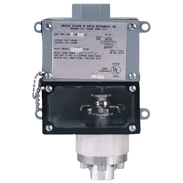 With extremely rugged construction the Series 1000W Weatherproof Diaphragm Operated Pressure Switch provides excellent reliability in chemical, petroleum and industrial plants. Bellville spring movement permits mounting of control in any position and helps prevent contact chatter. New design also provides high over-pressure protection. Weatherproof housing is standard.