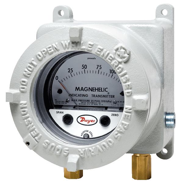 Brand: Dwyer Instruments, Inc.The ATEX/IECEx approved SERIES AT2605 Indicating Transmitter provides for both visual monitoring and electronic control of very low differential pressure in hazardous locations. The easily read dial gauge is complimented by the two-wire, 4 to 20 mA control signal utilizing the time-proven Dwyer® Magnehelic® gauge mechanical design and Series 600 transmitter technology.