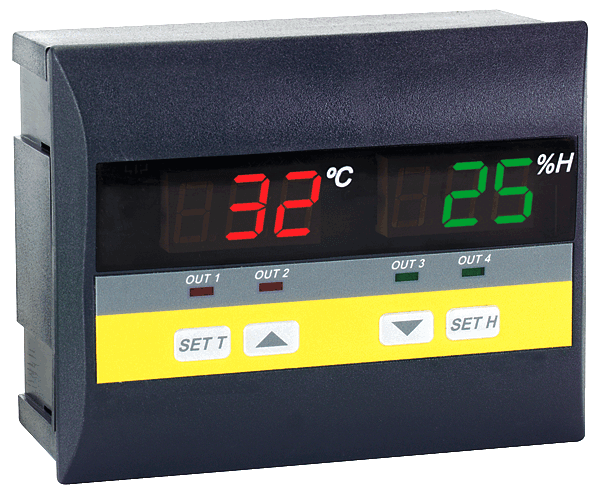 The SERIES THC simultaneously measures and controls temperature and humidity. The unit offers a 3-digit red display for temperature indication and a 3-digit green display indicating humidity. The Series THC is equipped with four independent relays, two for temperature control and two relays for humidity control.