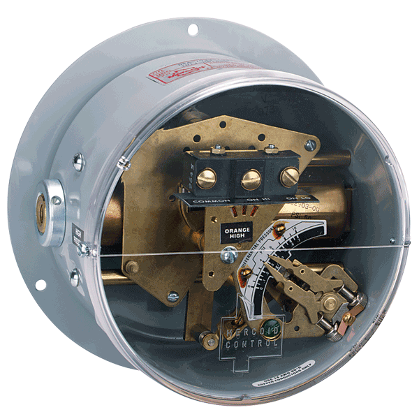 Various operations possible include single adjustment - fixed deadband, double adjustment - adjustable deadband, manual reset (increasing or decreasing pressure) and two stage with each SPST or SPDT switch independently adjustable. Standard enclosure is NEMA-1 style. Optional weatherproof construction is for outdoor use and explosion-proof enclosure meets requirements for Class I, Groups C & D; Class II, Groups E, F & G.